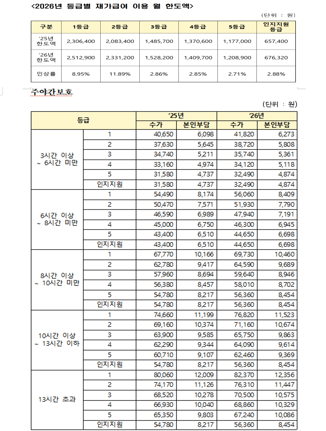 2026년도 등급별 재가이용 월 한도액 및 수가를 안내해 드립니다. ![]() |
