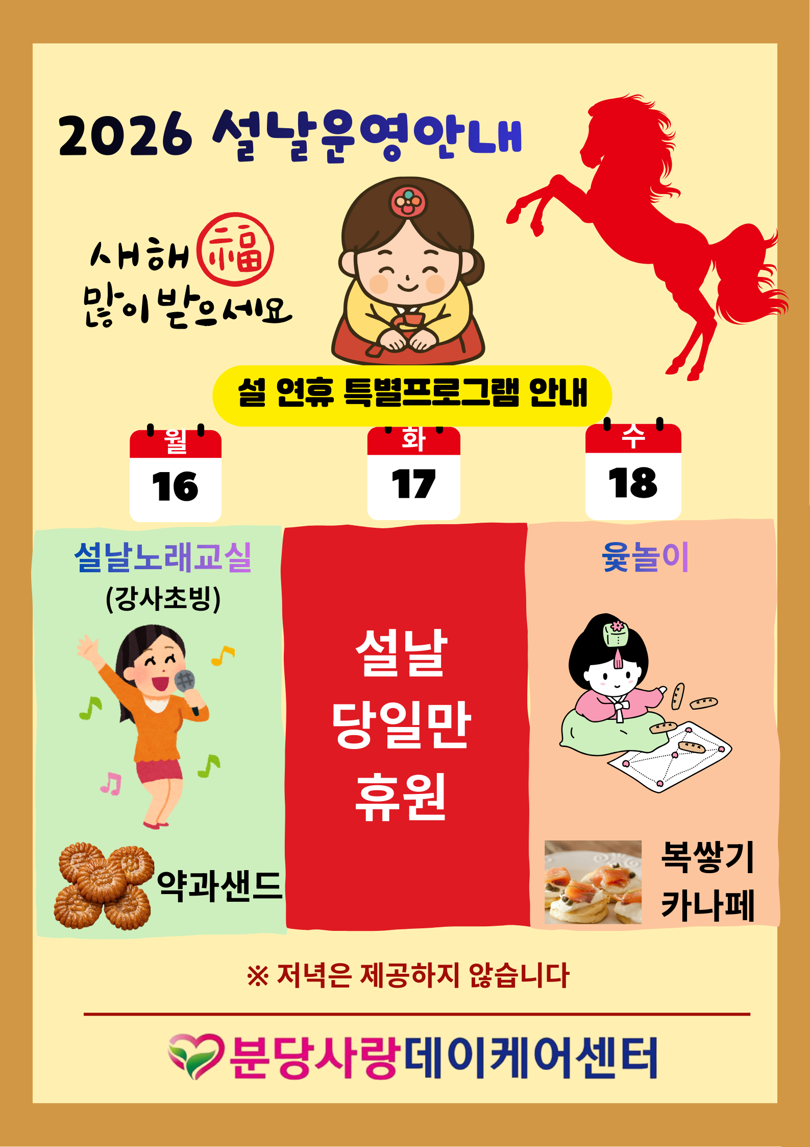[2026년 설 연휴 운영안내] 안녕하세요. 분당사랑데이케어센터입니다. 2026년 설 연휴 운영 일정을 아래와 같이 안내드립니다. ■2월 16일(월) - 설날 노래교실(외부강사) - 약과샌드 만들기 ■2월 17일(화) - 설날 당일 휴원 ■2월 18일(수) - 윷놀이 프로그램 - 복쌓기 카나페 만들기 ※ 설 연휴 기간 중 저녁식사는 제공되지 않습니다. 어르신들께 즐겁고 따뜻한 명절 시간이 될 수 있도록 준비하였으니 보호자님들의 많은 참여 부탁드립니다. 감사합니다. 분당사랑데이케어센터 드림 ![]() |